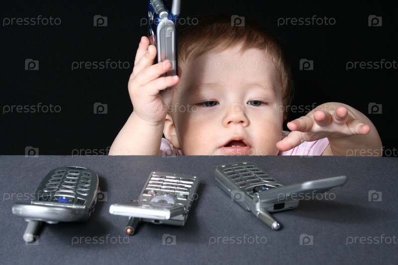 Ребенок с мобильными телефонами на черном фоне
