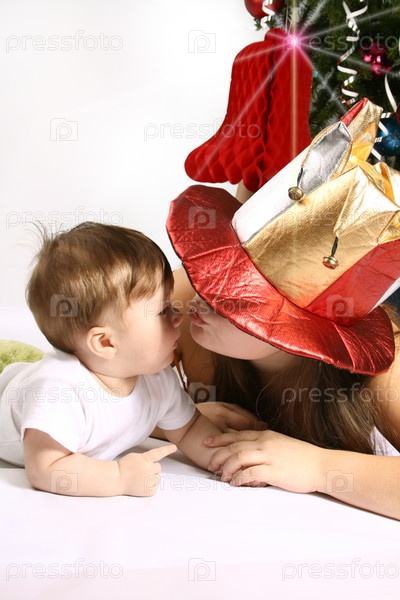 Малыш целует маму у новогодней елки
