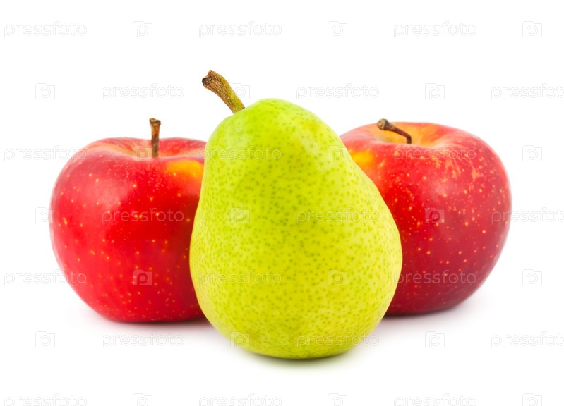 Два красных яблока и зеленая груша на белом фоне