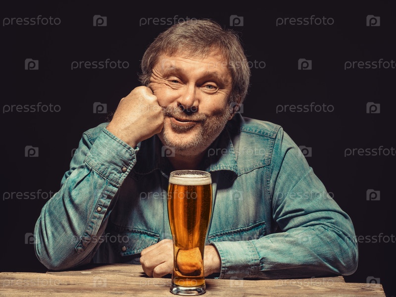 Довольный человек в Джинсовая рубашка с бокалом пива