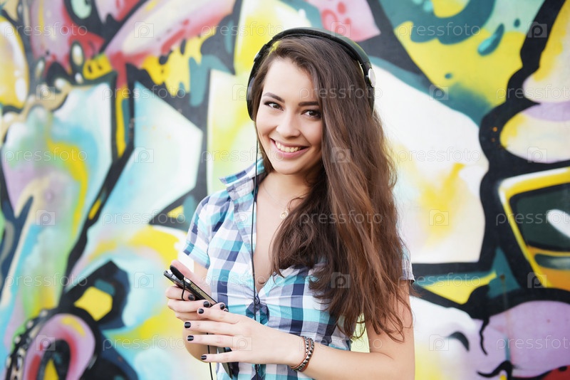 Портрет молодой женщины, сидя на стене графити