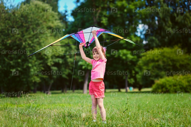 Маленькая девочка играть с цветными кайт в парке