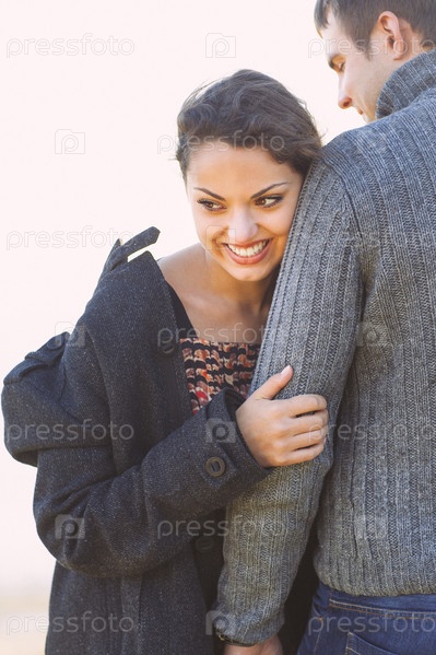 Портрет молодой счастливая пара, смеется в холодный день Осенний море