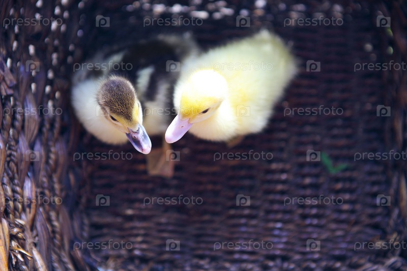 Два желтых утенок на открытом воздухе в корзину