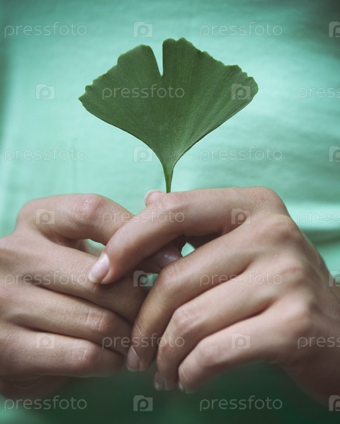 Женщина держит в руках листьев гинкго билоба