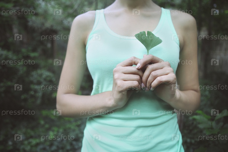 Женщина, держащая в руке листьев гинкго билоба