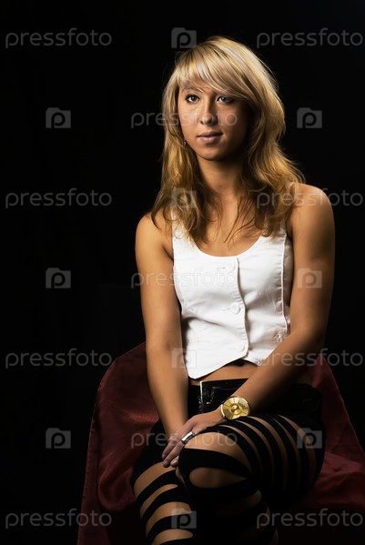 Привлекательная девушка на стуле на черном фоне