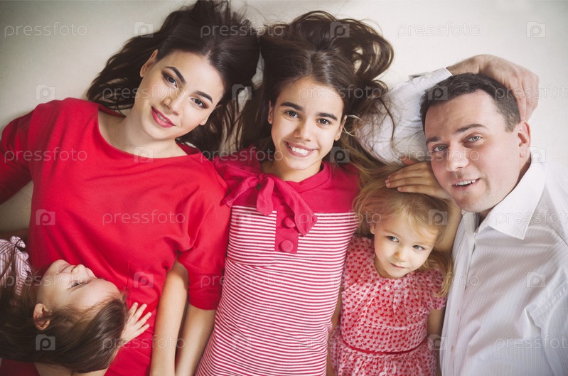Счастливые молодые семьи с детьми, лежа на полу