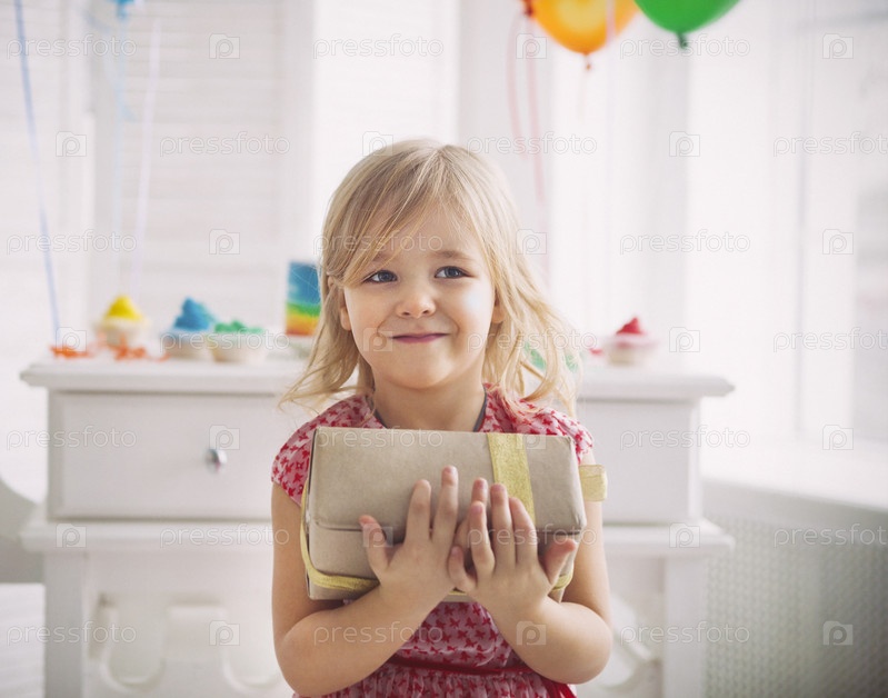Счастливый маленькая девочка с настоящим празднует свой день рождения