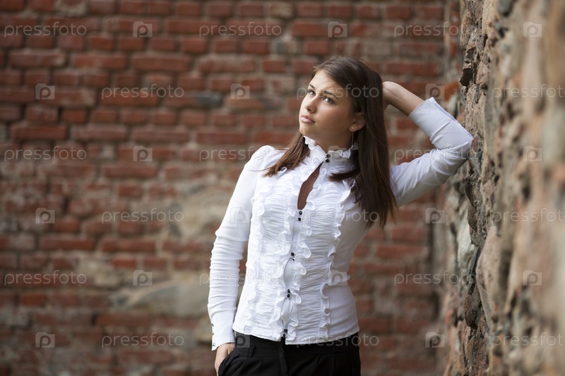 Девушка на фоне каменной стены