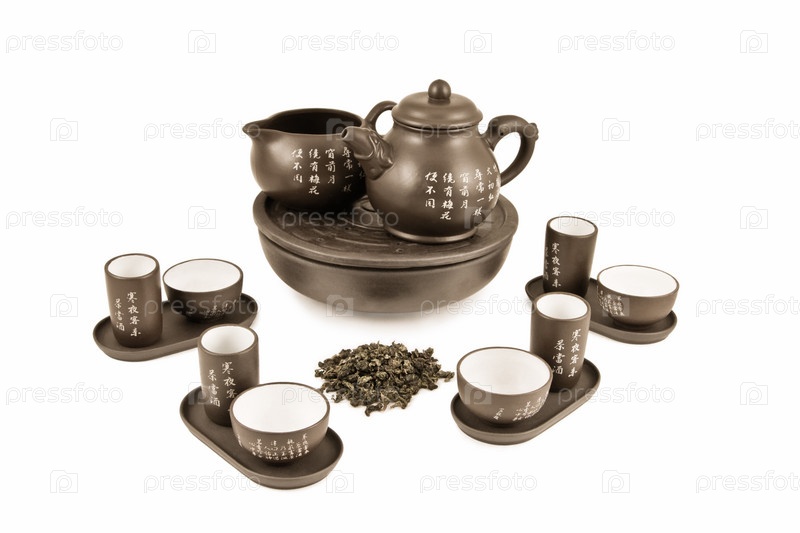 Заварочный чайник и чашки для чайной церемоний, изолированные на белом фоне