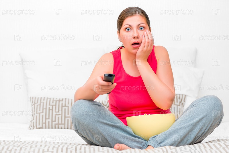Девушка с пультом дистанционного управления от телевизора изумленных