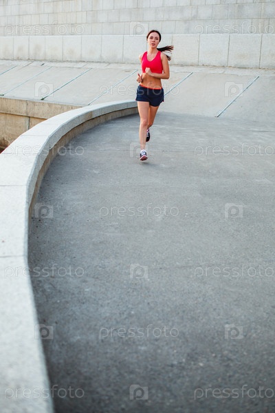 Женщина бежит вдоль изогнутого гранитного парапета