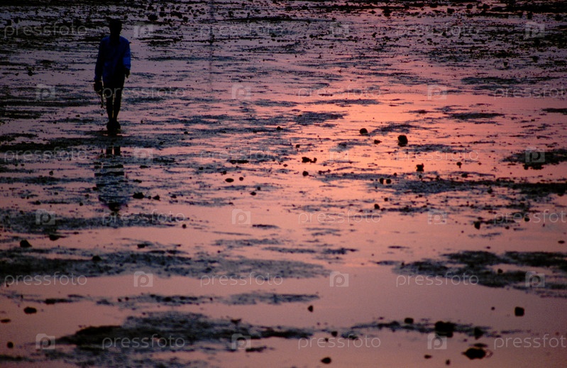 Человек идет по грязи в сумерках