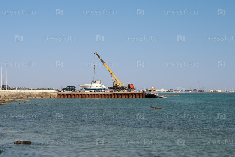 Кран поднимает лодку для запуска в море