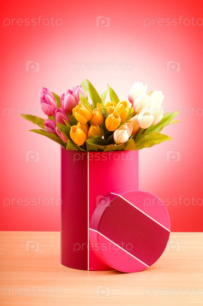 Подарочная коробка с тюльпанами на розовом градиентном фоне