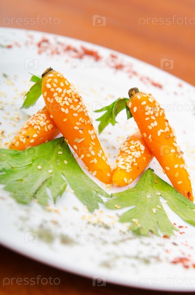 Вареная морковь, украшенная кунжутом в тарелке