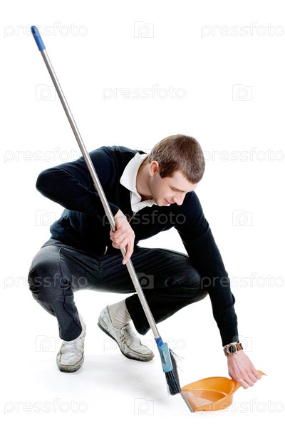 Молодой мужчина сметает мусор в совок