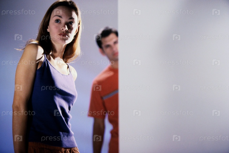 Портрет молодой женщины и мужчина стоял за углом