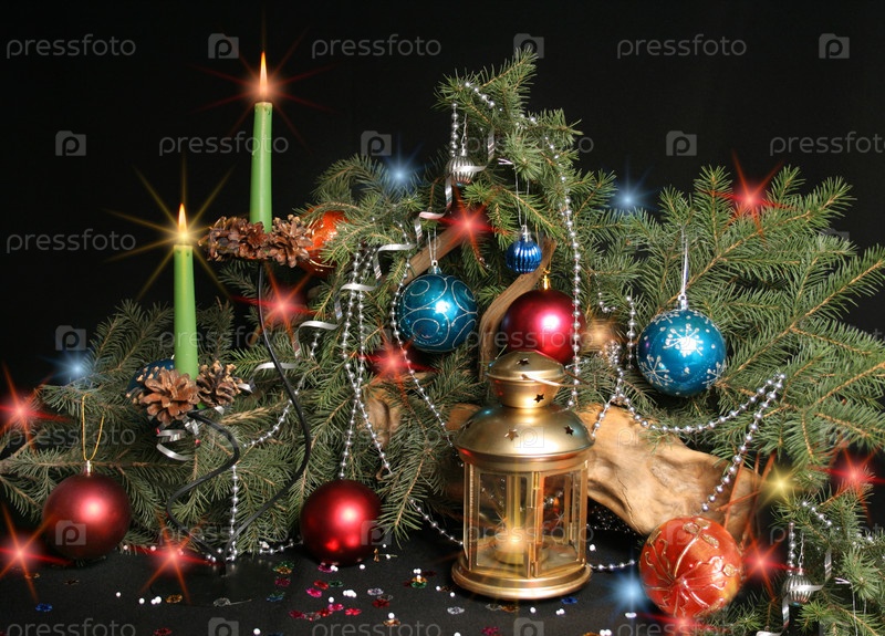 Новогодние украшения и ветви ели