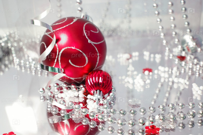 Новогодний шар и бусы на зеркальной поверхности