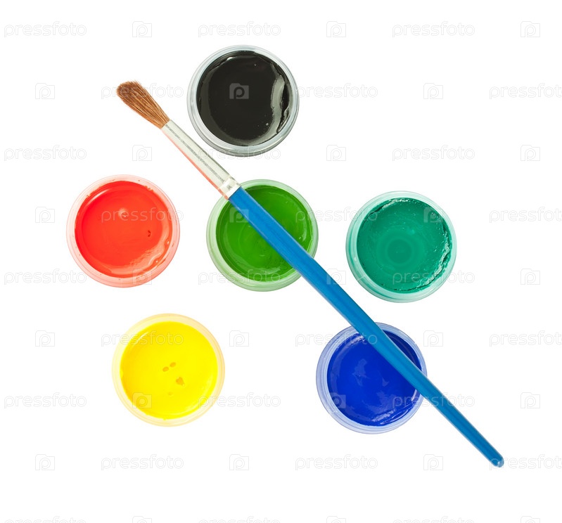 Кисть и банки с краской на белом фоне. Вид сверху