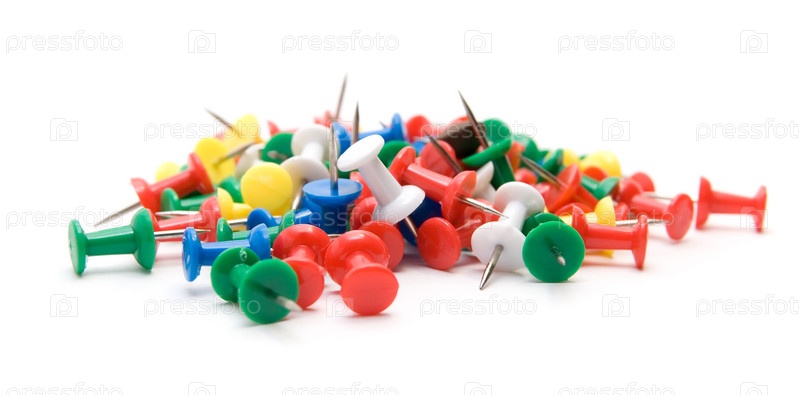 Множество разноцветных канцелярских кнопок. Изолированные на белом фоне