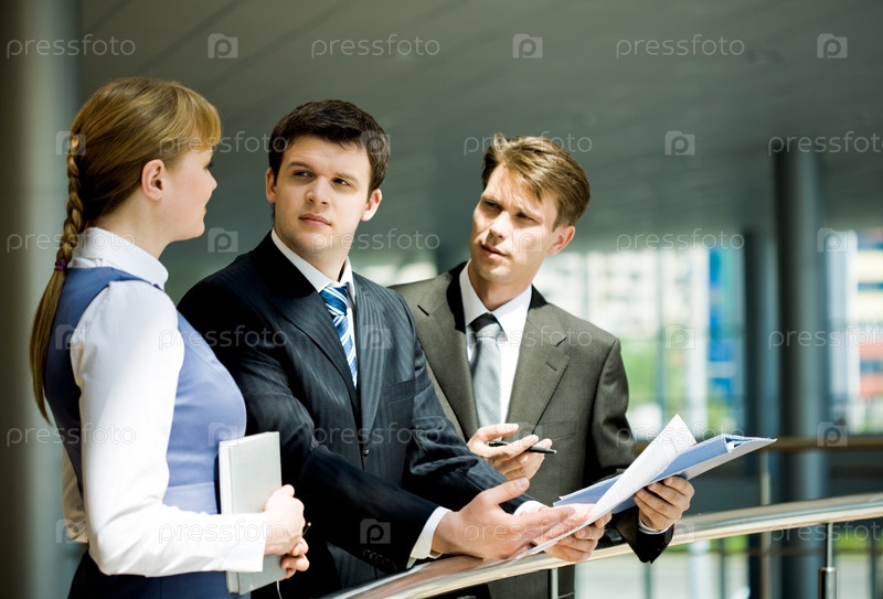 Два уверенных в себе бизнесмена смотрят на красивую специалистку, которая делится своими идеями