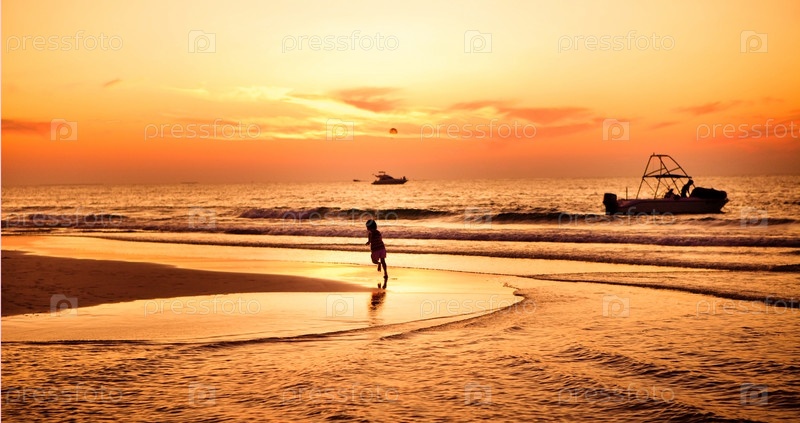 Ребенок бежит по пляжу на закате