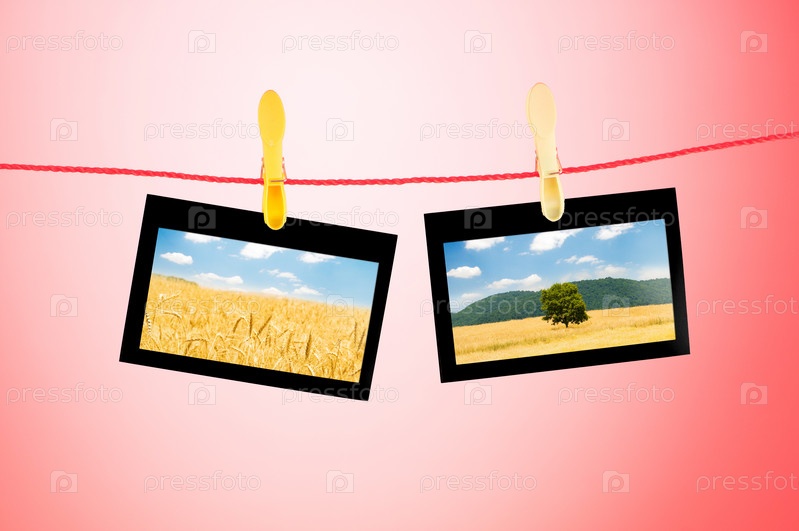Фотографии поля висят на прищепках на веревке