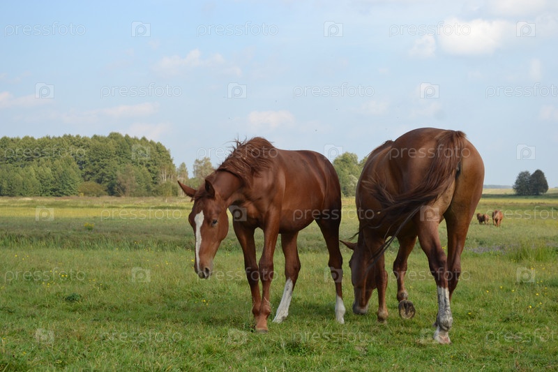 Две коричневые лошади на лугу