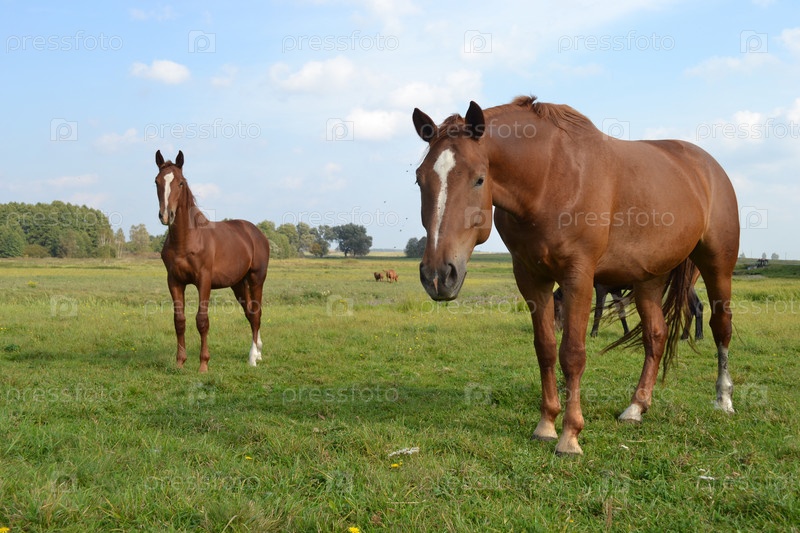 Коричневые лошади на лугу