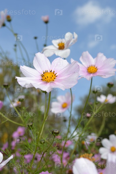 Осенние цветы космеи на фоне неба. Крупный план