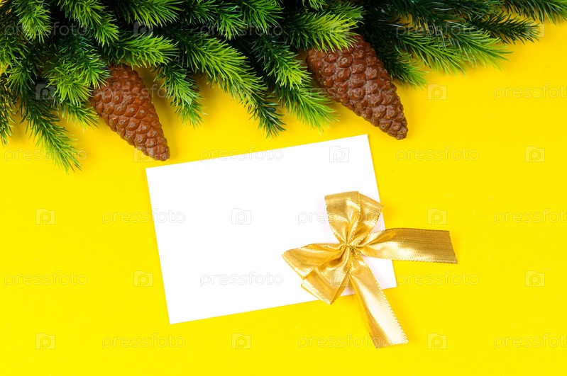 Еловая ветка и пустая карточка на желтом фоне