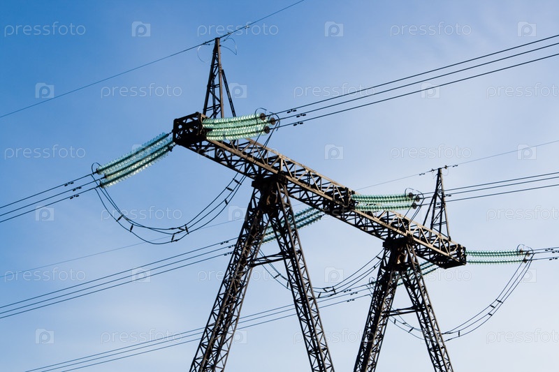 Изображение башни атомной электростанции с проводами на фоне синего неба