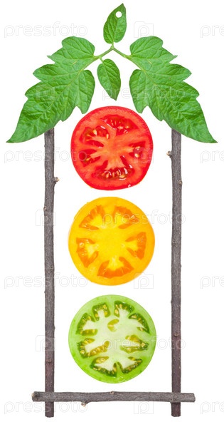 Цветные ломтики томата и зеленый лист на белом фоне