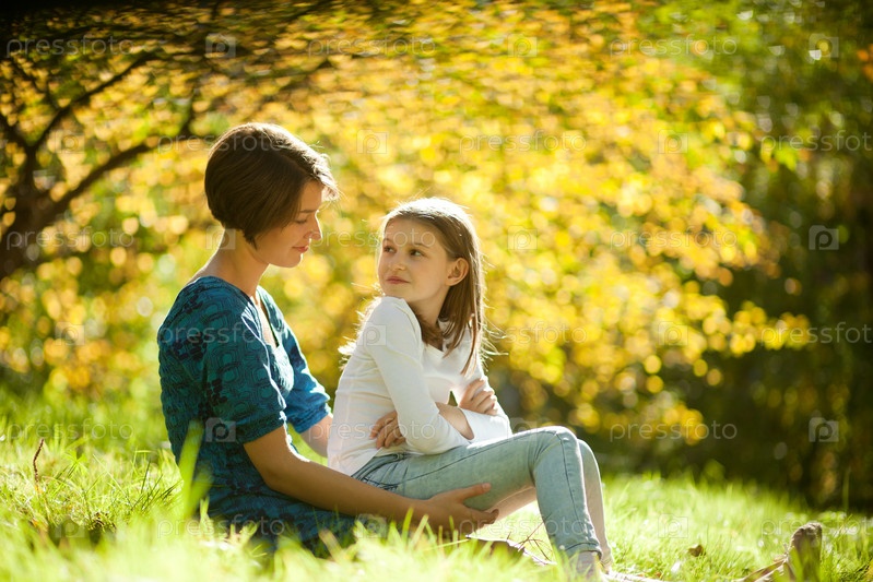 Две сестры сидят на траве в осеннем парке