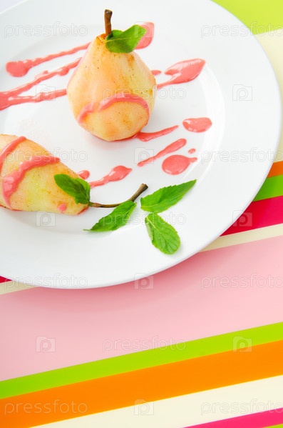 Десерт из груш на тарелке