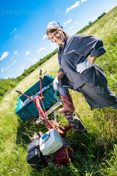 Женщина управляет культиватором