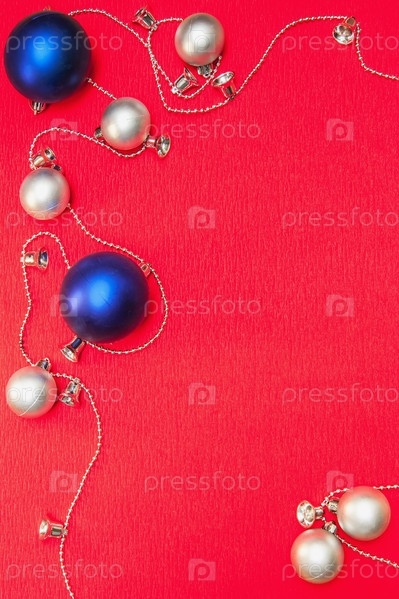 Елочные игрушки на красном фоне