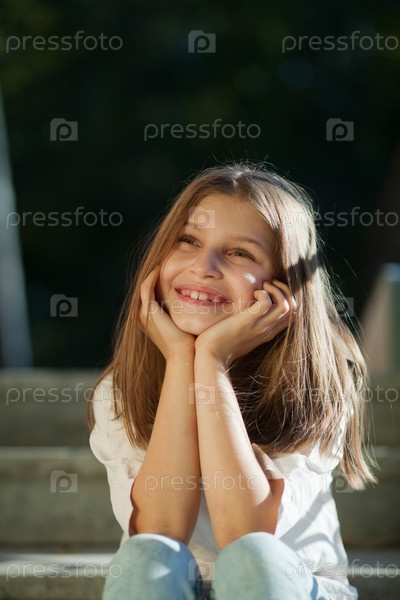 Девочка сидит на ступенях, подперев голову руками