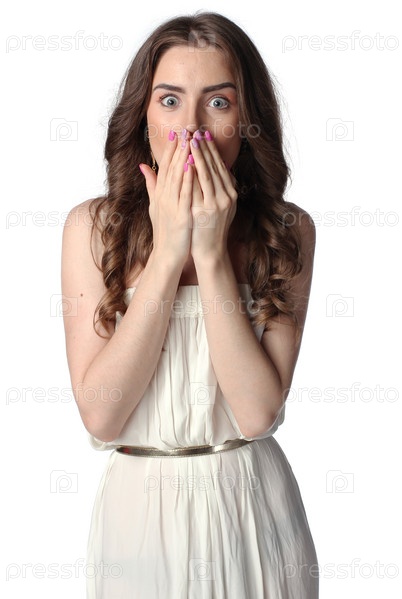 Шокированная женщина на белом фоне