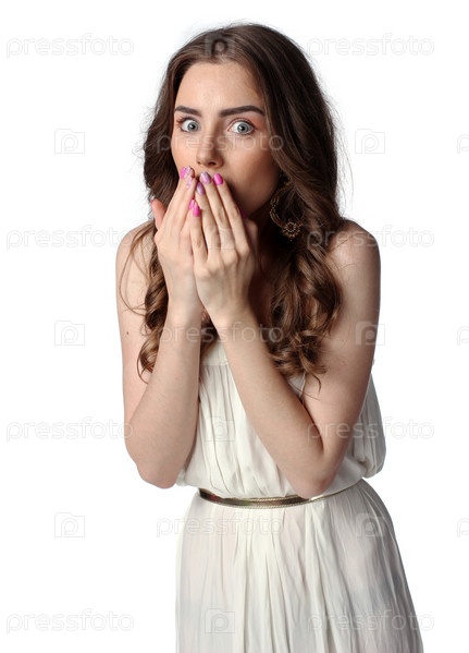 Шокированная женщина на белом фоне