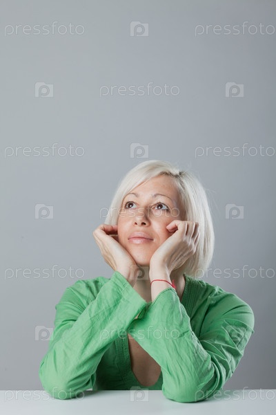 Задумчивая женщина в зеленом платье за столом. Серый фон