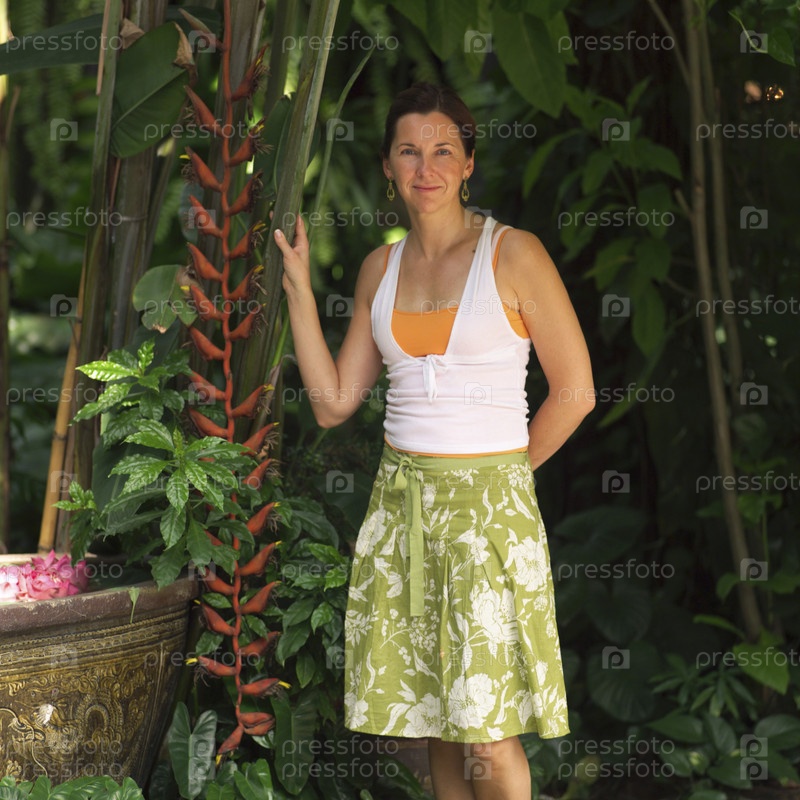 Зрелая женщина, стоя в саду