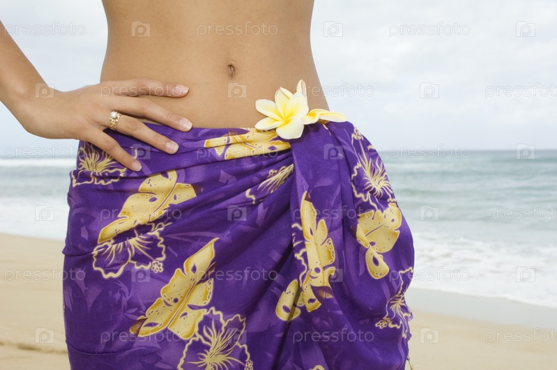 Середине разреза женщины стоя на пляже с ее руки на бедра