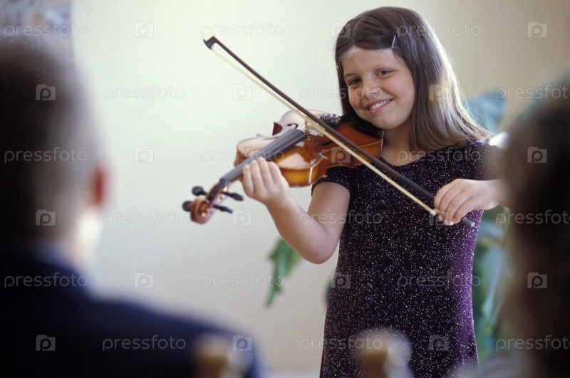 Девочка играет скрипка для родителей
