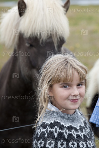 Блондинка девочка, стоя перед Исландская лошадь