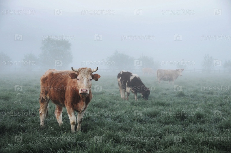 Коровы в поле, туманный