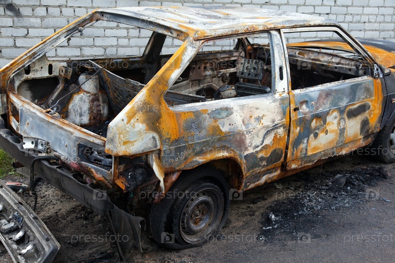 Старый сгоревший автомобиль на фоне кирпичной стены